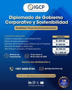 El Instituto de Gobierno Corporativo de Panamá (IGCP) invita a profesionales, directivos y líderes empresariales a participar en el Diplomado de Gobierno Corporativo y Sostenibilidad, una formación integral diseñada para fortalecer la toma de decisiones estratégicas y la buena gobernanza.
