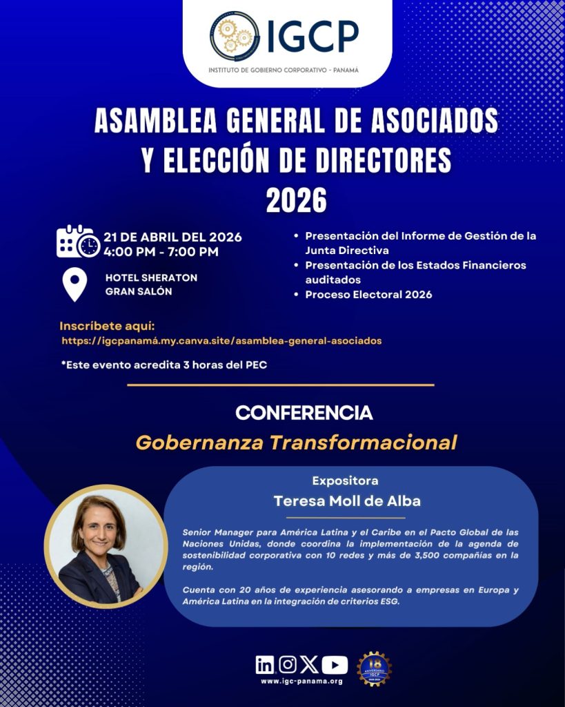 El Instituto de Gobierno Corporativo de Panamá invita a todos sus asociados a participar en la Asamblea General de Asociados 2026, que se llevará a cabo el martes 21 de abril a las 4:00 p.m., de forma presencial en el Hotel Sheraton, Gran Salón, en la ciudad de Panamá. Durante la jornada se realizará la […]