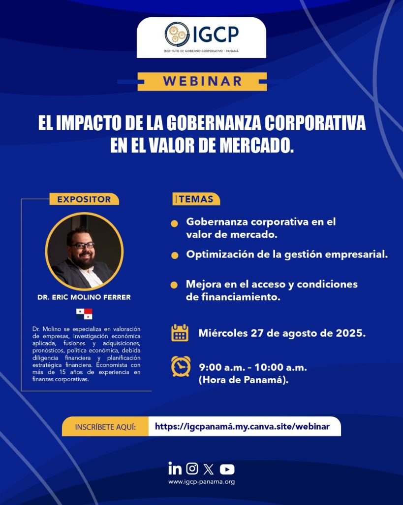El IGCP tiene el gusto de invitarle al webinar: El Impacto de la Gobernanza Corporativa en el Valor de Mercado Fecha: Miércoles 27 de agosto de 2025 Hora: 9:00 a.m. – 10:00 a.m. (hora Panamá) Expositor: Dr. Eric Molino Ferrer Durante esta sesión, se abordará temas clave como: – La relación entre gobernanza corporativa y […]